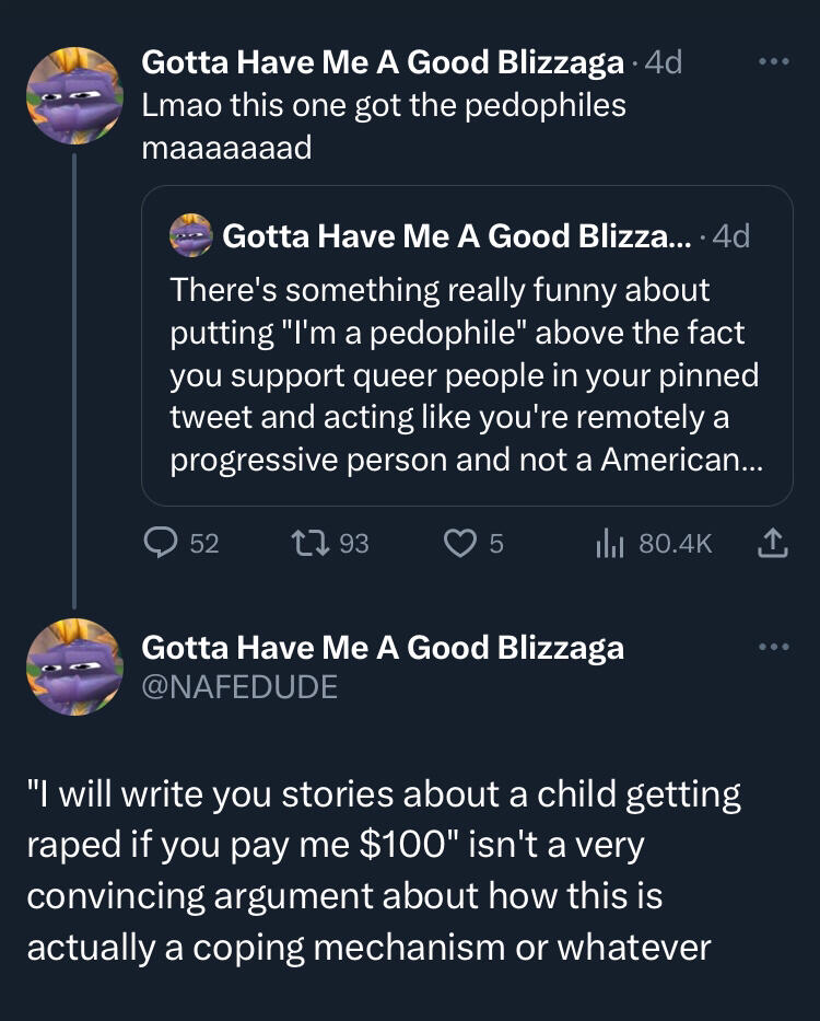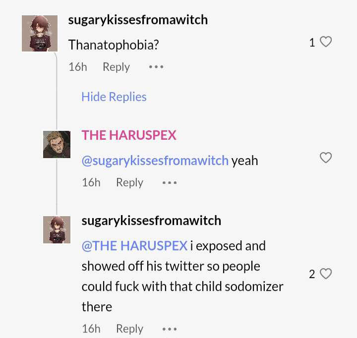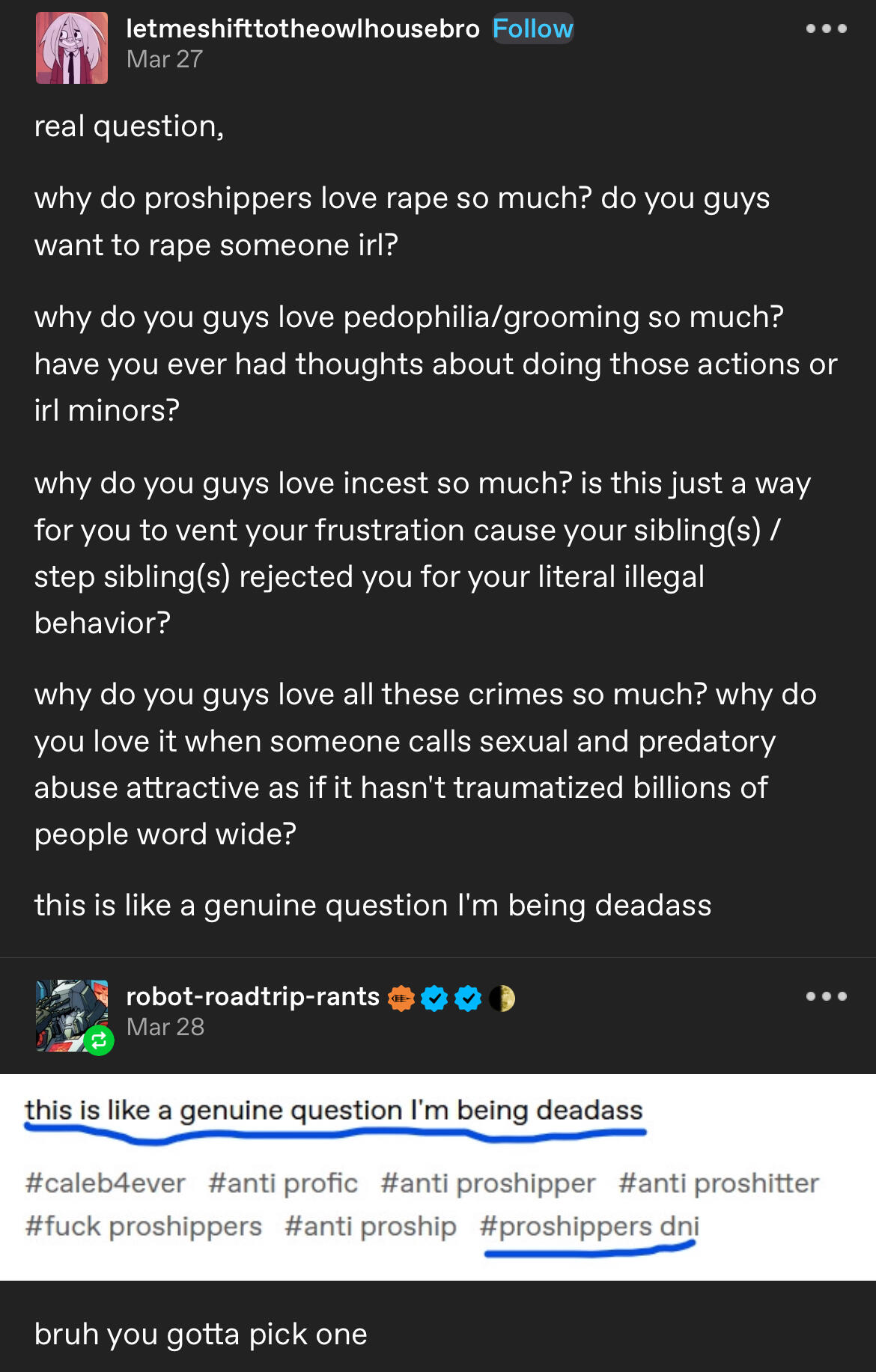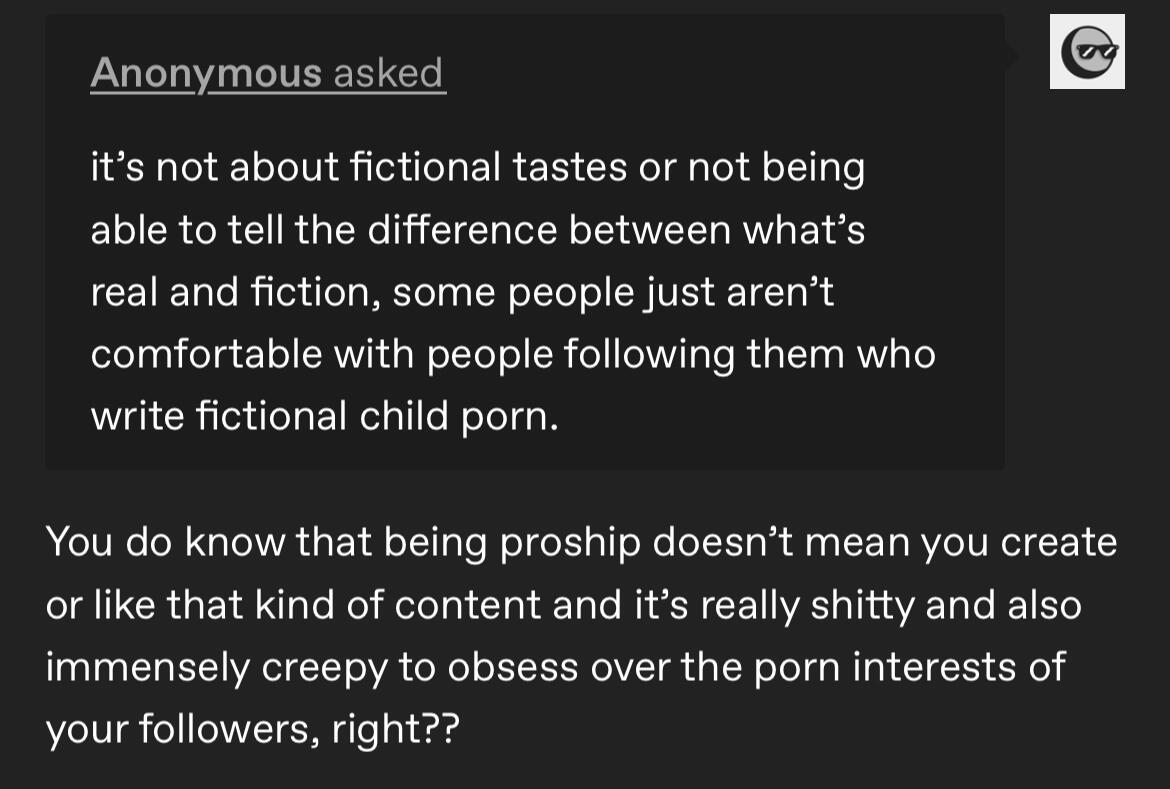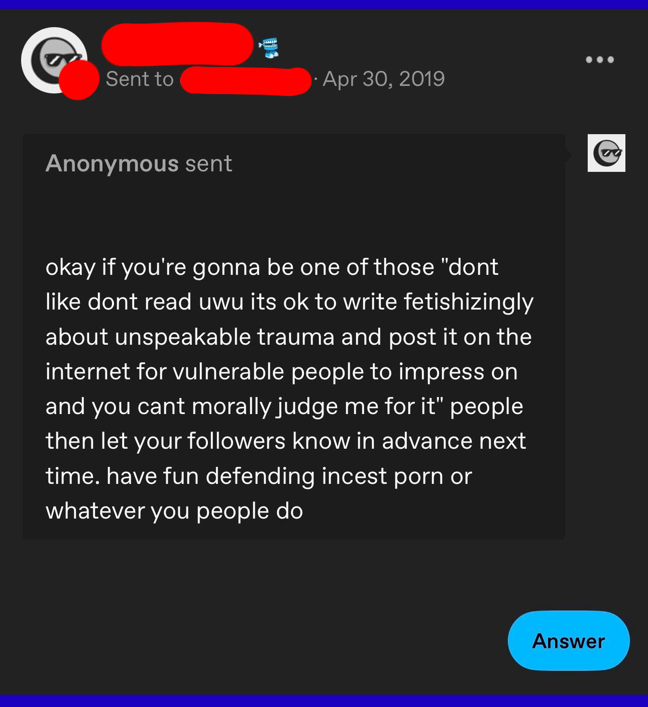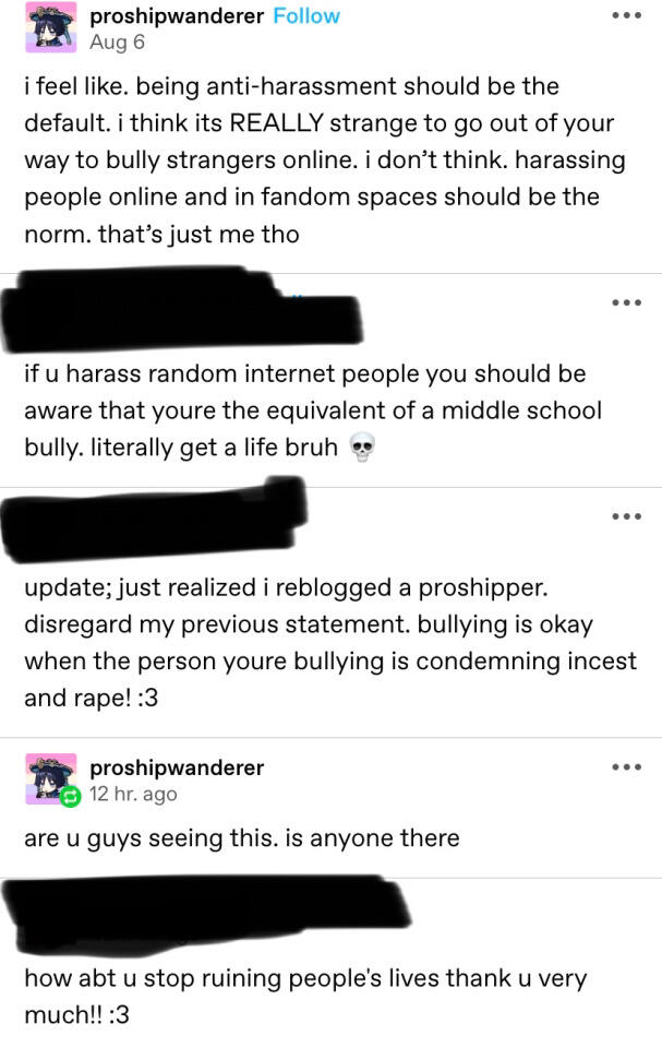 I have personally been told that I likely “enjoyed” or “deserved” my CSA trauma, all because I am a proshipper. These people believe that survivors who cope in ways they believe are bad do not deserve any respect.Antis have also been known to allow predators to flourish in their spaces, as they can use the claim they’re the only “safe adult” who understands these “bad ships” like them. It’s been proven time and time again that many antis end up engaging with abusive behaviours. Here’s one example, please view at your own risk as they may contain triggering content!
