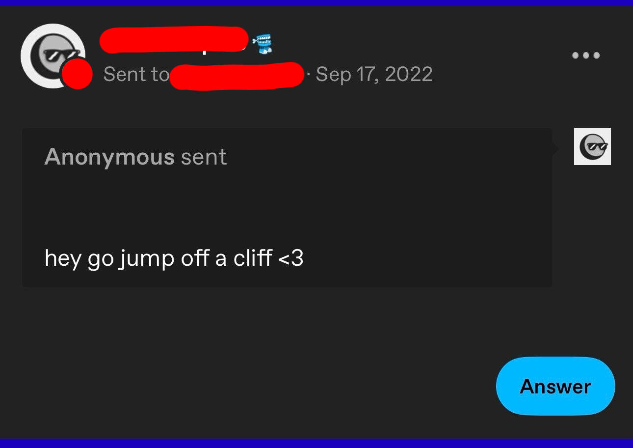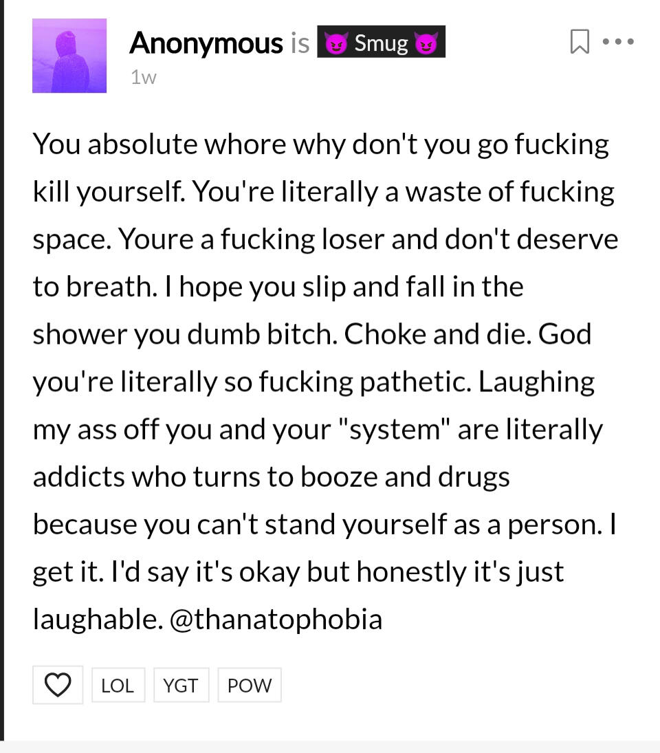 The entire mindset of antis is inherently harmful to survivors in a variety of ways, but the community is also known for repetitively attacking, dog piling, and harming proshippers just trying to live their lives and share content.Here’s a non exhaustive gallery of some of the things just me and my friends have experienced from antis.